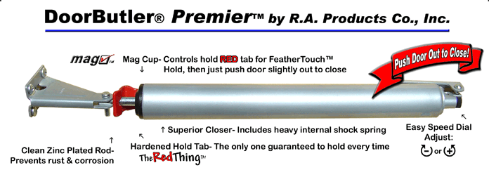 | US Pats & Pats Pend.: US.D395,995; US.D425,776; US.D425,399; US.5,829,098; US.5,953,789; US.6,032,331; US.6,397,431; US.6,640,387 . Door Butler®; The RedThing™; Charlie™; MagChek™; Premier™; Ultra™; Retro™; the reddish colored hold-open tab; and others are trademarks of R.A. Products Co. Inc., Denver, CO USA. Copyright © 1996-2005 RAPCO™ & Ricardo Alonso. Website by RAPCO | |